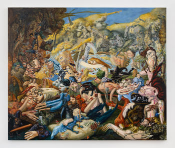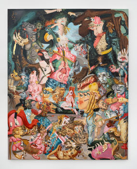 In Dannielle Hodson’s paintings, we encounter a bustling mass of faces, bodies, and ambiguous objects, which gather together with carnivalesque brio in dream- or nightmare-like pastoral landscapes. Charged with an energy that is at once comic, erotic, and incipiently violent, her elliptical motifs feel like they might dissolve, at any moment, back into the primordial matter of pure paint.