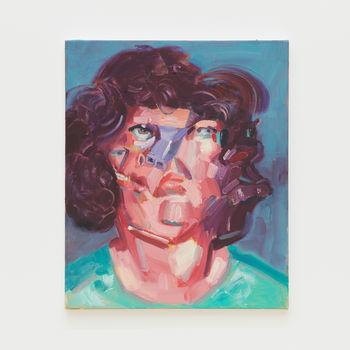 While ‘State of Play’ is an exhibition concerned, in part, with taking stock of the multiple crises facing our world, Hodson’s portrait works have a more intimate focus. These are not images of flesh-and-blood sitters, but of fictional women who have sprung from the meeting of the artist’s imagination and the demands of her paint. The colour palette of Iris is derived from Pablo Picasso’s 1930s paintings of his young daughter Maya, which depict her cuddling a baby doll – a form of ‘serious play’ in which a child adopts the persona of a parent, and anticipates the adult it will one day become. At first glance, Hodson’s portrait appears to show a grown woman in her twenties, but look closely – not only at her blue skin, but at the green swell of her hair, and even the patterns on her red sweater – and we see that she has not one face, but many, as though every stage of her personal history, from infancy to old age, exists within her simultaneously, either as a memory or as a potentiality. Perhaps some of these visages do not belong to her at all, but rather to other women – mothers, sisters, friends, enemies – who she’s absorbed into her being. Either way, she is not a fixed entity, but one that’s in constant flow. Like Hodson’s endlessly playful paintings, she contains multiple and often irreconcilable contradictions. This is what animates her, what gives her life.