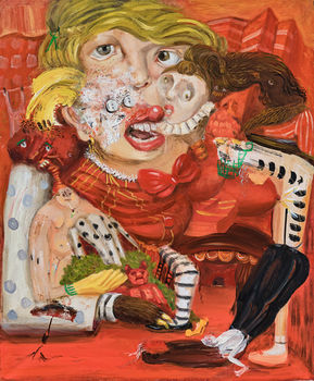 While Hodson’s portrait works are rooted in a long-established art historical genre, they subject its focus, the human face, to a series of destabilizing (and typically very funny) indignities. Looking at When Your Hand is a Sculpture(2022), in which a pair of heads are burdened, or blessed, with a panoply of incommensurate facial features, any notion of the essential boundedness and continuity of the individual human being is cast into doubt. Significantly, Hodson’s title calls our attention not to these jumbled, jostling visages, but to a body part that usually plays a subordinate role in portraiture, the hand, which we are told here is not a living appendage, but rather its sculpted double. If the artist’s invented ‘sitters’ appear alarmed at this eventuality, all staring eyes and open mouths, then they are blithely unaware, or perhaps unconcerned, that their faces are formed not of flesh but of that most animated and endlessly malleable of substances – Hodson’s paints.